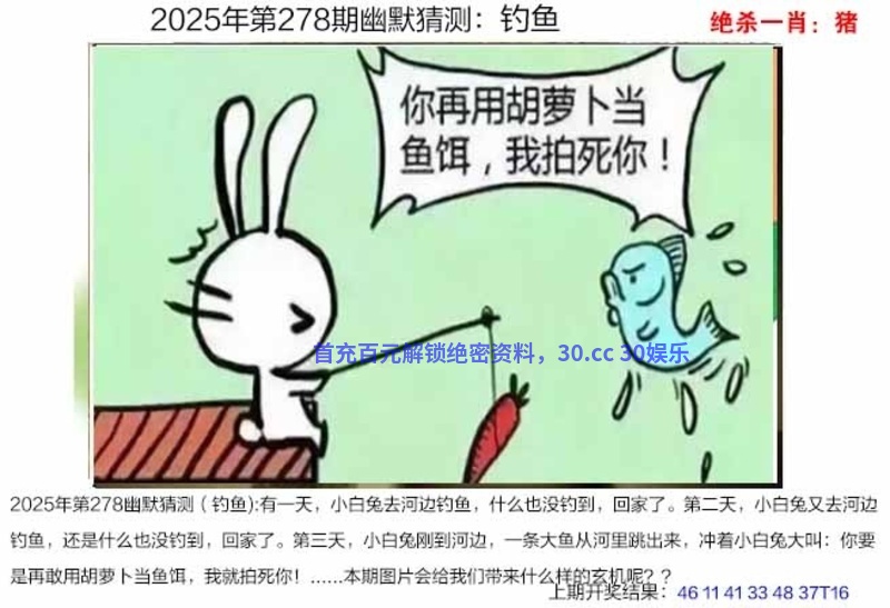 有一天,小白兔去河边钓鱼,什么也没钓到,回家了。第二天,小白兔又去河边钓鱼,还是什么也没钓到,回家了。第三天,小白兔刚到河边,一条大鱼从河里跳出来,冲着小白兔大叫:你要是再敢用胡萝卜当鱼饵,我就拍死你!.....本期图片会给我们带来什么样的玄机呢?