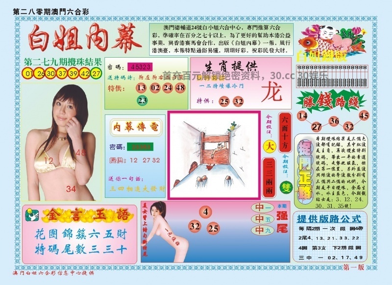 280期《白姐九肖》 综合九肖♘:牛龙猴猪马鼠鸡羊兔 综合七肖♘:牛龙猴猪马鼠鸡 ![]() |