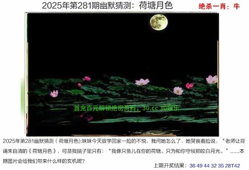 妹妹今天放学回家一脸的不悦,我问她怎么了,她哭丧着脸说,“老师让背诵朱自清的《荷塘月色》,可是我脑子里只有:“我像只鱼儿在你的荷塘。只为和你守候那皎白月光。”......本期图片会给我们带来什么样的玄机呢?